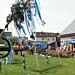 Zehn kräftige Siedler-Jungs rangierten es, auf einem fahrbaren Untersatz platziert, vom Asternweg kommend über die Äußere Plößberger Straße auf den Spielplatz: Dort wurde im Vorfeld der gemeinschaftlichen Aktion extra ein festes gepflastertes Fundament errichtet, damit das Häuschen stabil und sicherheitskonform steht.
