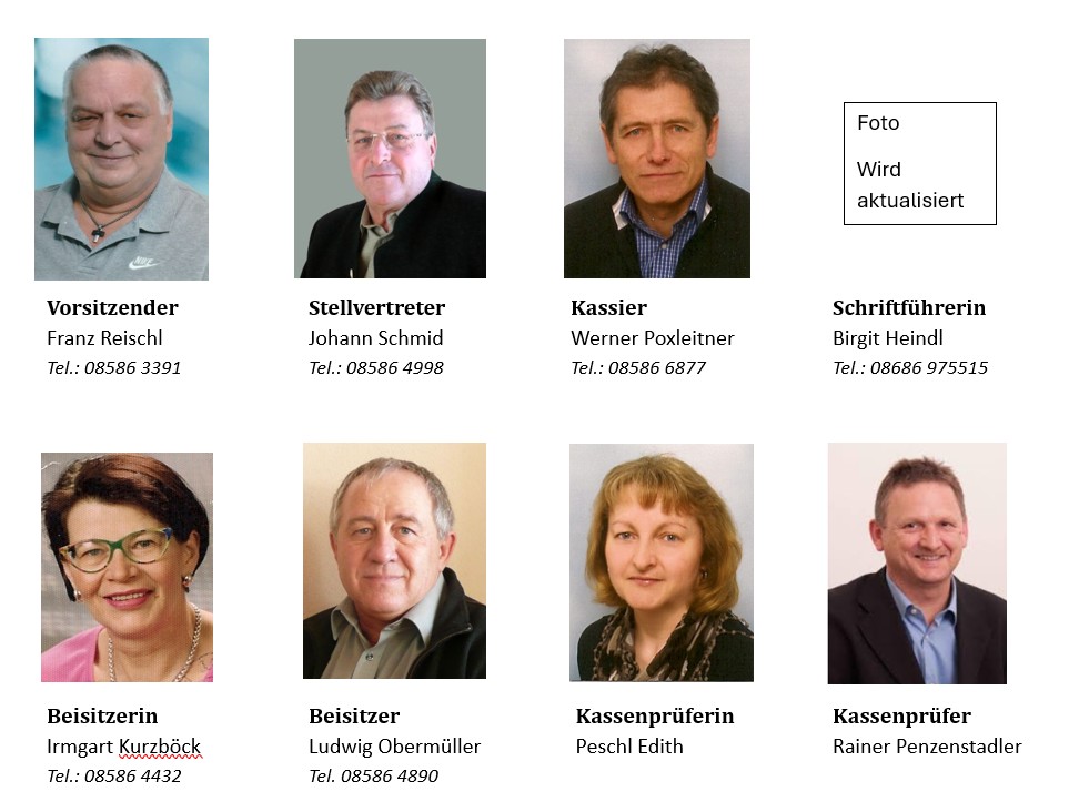 Stadtrat Obermeier Otto, Berzirksvorsitzender Breitenfelner Johann, Kassenprüferin Peschl Etith, ehem. Bezirksvorsitzender Zechmann Bernd, Beisitzerin Kurzböck Irmgart, Kassier Werner Poxleitner, Schriftführerin Heindl Birgit, Kassenprüfer Penzenstadler Rainer, 2. Vorstand Schmid Johann, 1. Vorstand Reischl Franz, Beisitzer Obermüller Ludwig