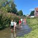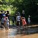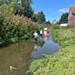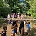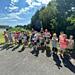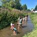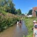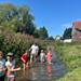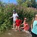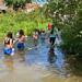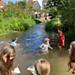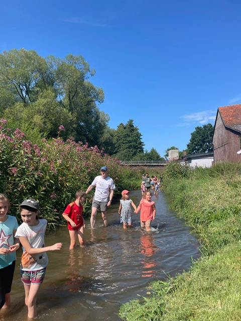 Nach einem gemeinsamen Gruppenfoto mit den wunderschönen Booten stiegen wir in das Flüsschen "Luhe" ein. Am Anfang war es schon eine kleine Mutprobe, in das noch recht kühle Nass zu steigen, denn es hatte 3 Tage vorher heftig geregnet. Kurz nach dem Einstieg konnte man den Biberbau bestaunen, der innerhalb eines Jahres vom fleißigem Biber in der Luhe gebaut wurde. Spaß und Geschicklichkeit war dieses Jahr beim Übersteigen von 2 Bäumen notwendig, die der Wind umgeworfen hat und über der Luhe lagen. Es machte den Kindern wieder einen riesigen Spaß, bei den warmen Temperaturen durch das etwas kühlere Wasser zu waten und auf das Wettrennen der Boote zu warten. Nach dem Start der Boote stapften die Kinder im Wasser hinter ihren Booten zum Endziel. Nach dem Zieldurchlauf stiegen wir wieder aus dem Wasser, holten die Boote heraus und marschierten gemeinsam zum Spielplatz.