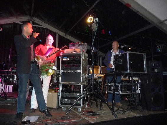 Der Bürgermeister W. Gehrke überreicht einen Blumenstrauß an das Geburtstagskind DJ Hartmut Gruschwitz.