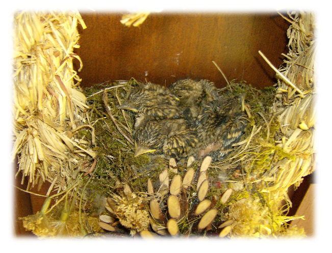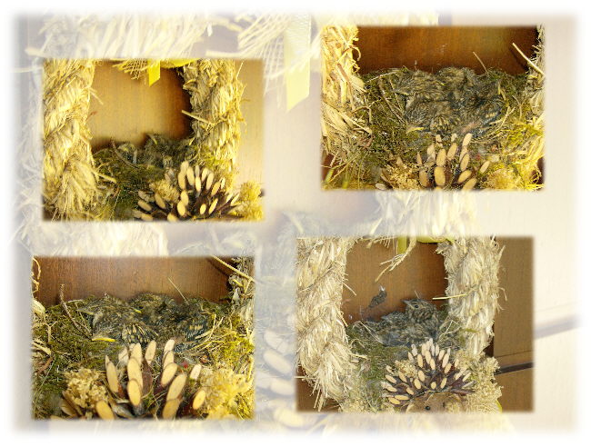 dass die Haustür auf und zugemacht wurde.Inzwischen befanden sich fünf junge Finken in dem Nest die nur die Köpfe hebten wenn sich die Haustür öffnete. Seit kurzem sind die "Gäste" wieder ausgeflogen.