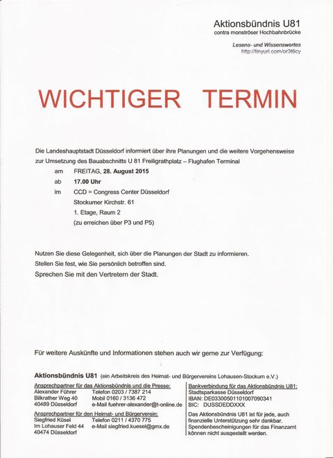 Kaum im Amt gewählt, hatte die Presse schon berichtet, dass Thomas Geisel, als neuer Oberbürgermeister der Landeshauptstadt Düsseldorf, die nach langwierigen Verhandlungen an 3 Veranstaltungen am "Runden Tisch U 81" letztendlich im Konsens gefundene