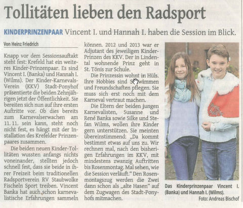 Seit 47 Jahren schlägt das Herz der Familie van de groote Poort vom KKV Stadtponyhof für Kinder. Für die Session 2014/2015 haben sie sich einen "Lindentaler" ausgesucht. Vincent I. (Banka) und seine Prinzessin Hannah I. (Wilms) wurden bereits am 18. Januar im Spiegelsaal des Krefelder Hofs inthronisiert. Nach dem Einzug des KKV mit der befreundeten Tanzgarde der Karnevalsgesellschaft Neukirchen-Vluyn nahmen der Bürgermeister Frank Meyer und der Schirmherr Bernd Scheelen des KKV die Proklamation vor. Als Ehrengast wurde der ehemalige SPD-Chef Franz Müntefering begrüßt, der mit seiner Frau Michelle angereist war. Sie wurde wie ihr Mann, in den Adelsstand erhoben und Ehrenrittmeisterin. Die Laudatio hielt der SPD Fraktionvorsitzende im Düsseldorfer Landtag Norbert Römer. Die befreundeten Kinderprinzenpaare aus Düsseldorf, Oppum und St. Tönis erfreuten die Familien und Freunde des KKV, des Prinzenpaares und die ebenfalls anwesende Krefelder Karnevals- und Politprominenz mit ihrem Können. Das Kinderblasorchester der Musikschule Krefeld sorgte für musikalische Untermalung.