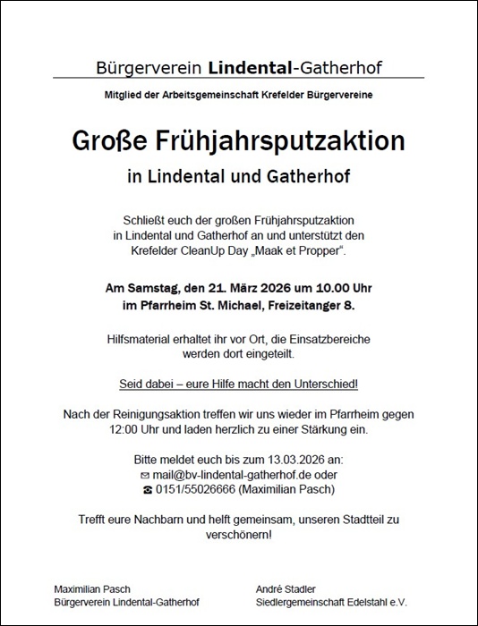 Große Frühjahrputzaktion - Samstag 21.03.2026 Treffpunkt Parrheim St. Michael um 10 uhr.