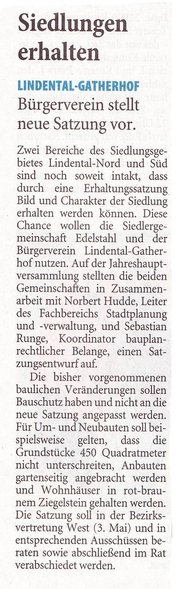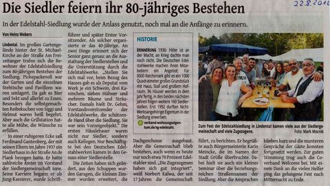 #Von Egon Traxler #14. April 2013 # # #Der Stadtspaziergang der Grünen in der Edelstahl-Siedlung Lindental findet zahlreiche Interessierte. # #Krefeld. Ganz fern nur klingt der Geräuschpegel des Verkehrs der Forstwaldstraße herüber. Die Edelstahl-Siedlung Lindental - ein Städtchen in der Stadt. Architektur und Infrastruktur haben auch nach 77 Jahren ihr Profil erhalten. Ganz tief tauchen die über 50 Teilnehmer des Stadtspazierganges in die soziale und politische Geschichte dieser Siedlung im Krefelder Westen ein. Seit elf Jahren bietet das Bündnis ´90/Die Grünen diese Spaziergänge durch besondere Ecken der Stadt an. # #In Lindental wurde bis in die 60er Jahre hinein sogar eine eigene Erntekönigin gewählt. Genau weiß es Hans Brüx (74) nicht mehr. "Aber eine der letzten lebt noch hier. Ich habe sie vor ein paar Tagen getroffen", schmunzelt der Heimatforscher. So lange dienten die großen Grundstücke auf 255 Parzellen wie in den Gründerjahren ab 1936 als Nutzgärten mit Kleintierhaltung. Obst und Gemüse ergänzten den Speiseplan auch noch in den Jahren des Wirtschaftswunders. # #Heute dienen die meist 1000 Quadratmeter großen Areale der Erholung und Freizeit. Hinter den noch nicht grünen Hecken ist nicht selten ein kleiner Pool zu sehen. "Geplant war auf dem Freizeitanger sogar ein Freibad", erzählt Brüx. Hans-Peter Glasmacher vom Vorstand der Siedlergemeinschaft ergänzt trocken: "Leider kam der Zweite Weltkrieg dazwischen." # #In den Gründerjahren war der Alltag hart # #Was heute nach Rundum-Idylle aussieht, war in den Gründerjahren harter Alltag. "Wir hatten zwar Strom, aber keine Kanalisation", erinnert sich der hier aufgewachsene Brüx. Die menschlichen Ausscheidungen wurden die Woche über in einer speziellen Kiste gesammelt. "Am Wochenende kamen sie dann als Dünger auf die Scholle. Furche für Furche", lacht Hans Brüx, der frühere Berufsschullehrer. # #Die heute rund 1000 Menschen in der Siedlung leben in einer Umgebung von gestern, geprägt von einer Architektur des Germanismus’. Auf den rund 35 Hektar hat der Hülser Architekt Carl Dahmen seine verklinkerten Vorstellungen der Zukunft gesetzt. Dahmen (1884-1976) "genoss das besondere Wohlwollen der NSDAP" (Stadtgeschichte, Band 5, Seite 208). # #Zwischen 5000 und 7000 Reichsmark kosteten damals die Häuser # #