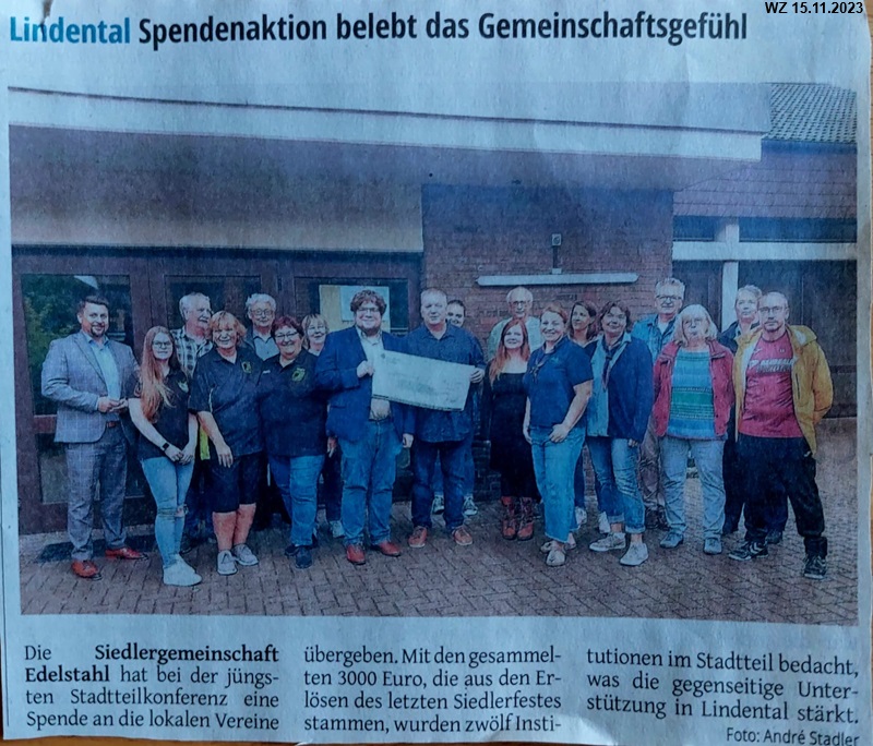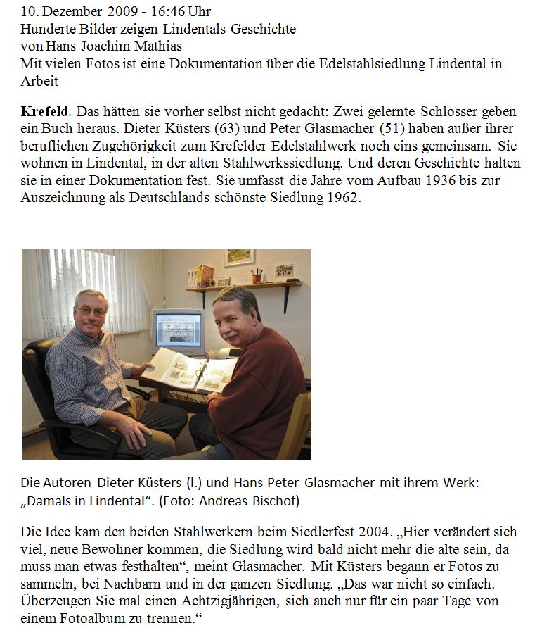 #Buch ,,Damals in Lindental,, # #Nun ist es geschafft! Zweieinhalb Jahre nach dem Erscheinen ist die gesamte Auflage verkauft. Aus diesem Anlass wurde nun der restliche Ertrag, 2400 € aus dem Verkauf gespendet. In einer kleinen Feierstunde in der Erlöserkirche gingen jeweils 400 € an die Erlöserkirche, an die Pfadfinder der St. Michaelkirche, an die St. Michael Schule, die Lindenschule, den Städt. Kindergarten, Am Kinderhort und an die Siedlergemeinschaft Edelstahl. Nach unserer ersten Spende von 9000 € im Jahr 2012, wurden so insgesamt 11400 € durch den Buchverkauf gespendet. #Nochmals vielen Dank an alle Siedlerinnen und Siedler die uns unterstützt haben und ohne deren Mithilfe dieses Buch nicht zu Stande gekommen wäre. #Vielen Dank an alle, die an unserem Buch mitgeschrieben haben. #Ein großer Dank an alle Sponsoren die unser Buch durch ihre Spende finanziert haben. #Dann möchten wir uns ganz herzlich beim Bezirksvorsteher West Hans - Josef Ruhland bedanken, der die Idee zu diesem Buch hatte und uns in allen Belangen die das Buch betrafen, unterstützt hat. #Nicht vergessen wollen wir die freundlichen Menschen die unser Buch mit verkauft haben. Herzlichen Dank an: #Bäckerei Krocker, Forstwaldstr. #Fahrrad Burbach, Dülkenerstr. #Bäckerei Knops, Dülkenerstr. #Sparkasse Lindental #Fahrrad Mücke, Marktstr. #Lotto/Toto Tackheide, Zur Alten Schmiede #Restaurant Forsthaus, Forstwald #Restaurant Montenegro, Ecke Nauenweg #Metzgerei Peters, Blumenstr. #Städt. Kindergarten, Am Kinderhort #Einen besonderen Dank an Josef Rippers vom REWE Markt, der alleine 120 Bücher verkauft hat. #Wir möchten hier einmal erwähnen, dass unser Buch nicht nur in unserer Region verkauft wurde. Es gingen Bücher nach England, in die USA und sogar auf die Philippinen. Auch liegt unser Buch in der Deutschen National Bibliothek, in Landes Bibliotheken und im Stadtarchiv Krefeld. #Wir hoffen, dass alle Gefallen an unserem Buch gefunden haben, denn es erzählt die Entstehungsgeschichte einer einzigartigen Siedlung. # #H.P. Glasmacher & D. Küsters #
