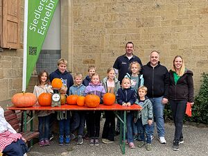 Die jungen "Kürbis-Könige" stellten sich zusammen mit ihren Produkten und der Vorstandschaft der Siedlergemeinschaft stolz dem Fotografen