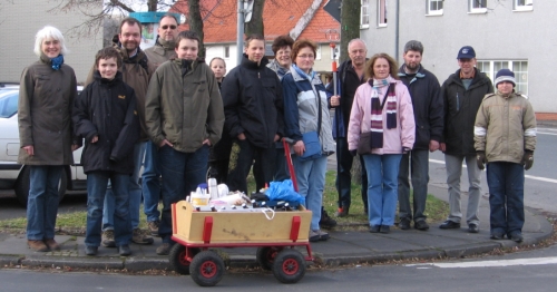Am Samstag, den 1.3.08 zog das Sturmtief "Emma" über das Land. Bäume knickten um, Dächer wurden abgedeckt, Sturmböen und Regen machten den Aufenthalt im Freien nicht besonders reizvoll. Auch am Sonntag Morgen stürmte und regnete es noch. So gab es auch erste Absagen von denen, die nicht glauben wollten, dass das Wetter am Sonntag Nachmittag besser wird und wir bei Sonnenschein boßeln können. Aber es stimmte. Bereits vor dem Start schien die Sonne. Der Wind hatte nachgelassen, sorgte jedoch immer noch für eine Athmosphäre wie an der Küste. "Dann passt ja alles", meinte einer der Teilnehmer, "schließlich kommt der Sport ja von der Küste". Nachdem auch die eingetroffen waren, die erst alter Gewohnheit folgend nach Bovenden zum Treffpunkt der letzten Jahre gefahren sind, konnten wir starten.