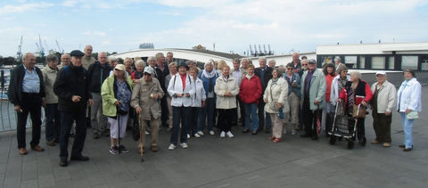 Teilnehmer der Hamburgfahrt © Wolfgang MeierDie diesjährige Tagesfahrt der Siedlergemeinschaften führte 54 Siedlerfreunde und Gäste nach Hamburg. Trotz zahlreicher Baustellen und Staus schaffte es der Busfahrer von Fa. Reichmeister, uns pünktlich an den Landungsbrücken abzusetzen. Dort lag schon die Barkasse, die uns zu einer historischen Fleetrundfahrt erwartete. Auf der zweistündigen Fahrt erlebten wir das historische Hamburg auf den alten Fleeten und Kanälen der Innenstadt. Die Schiffsführerin meisterte gekonnt mehrere Schleusendurchfahrten und erläuterte die Sehenswürdigkeiten. Durch enge Passagen und unter zahlreichen alten und neuen Brücken ging es durch den Nikolaifleet, dem ersten Segelschiffhafen Hamburgs und damit dem Ursprung des heutigen Welthafens. Wen-depunkt der Fahrt war die Brücke vor der Binnenalster, von dort war das Rathaus mit seinem hohen Turm zu sehen. Die Rückfahrt führte durch die historische Speicherstadt mit ihren Warenlagern für Teppiche, Kaffee und Gewürze aus aller Welt. Zu guter Letzt passierten wir die Elbphilharmonie.