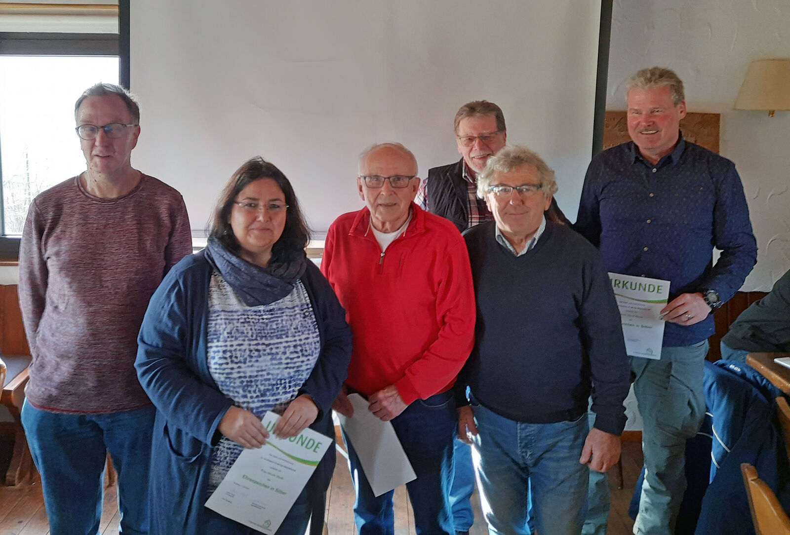 Nicole Stodt, Georg Padberg, Horst Risse und Klaus Köller wurden für ihre 25-jährige Treue zur SGM mit Nadel/Brosche, Urkunde und Weinpräsent geehrt.