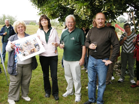 Mit Spielen Siedlergemeinschaft 1 gegen Bürgermeister/Gemeinderäte und Siedlergemeinschaft 2 gegen Deutsch-franz. Freundeskreis wurde der neue Bouleplatz eröffnet.Die Vorsitzende vom Deutsch-franz. Freundeskreis, Frau Monika Franck gratulierte zur Eröffnung und überreichte eine Fotocollage vom Turnier und ein Fässchen Rotwein.