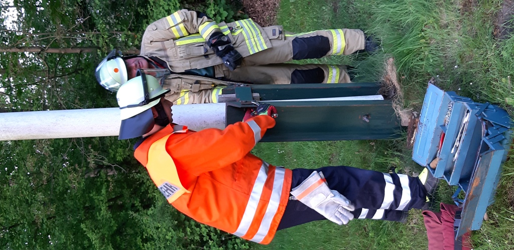 Er hatte schon bessere Tage gesehen, der Kranz am Maibaum auf dem Dorfgemeinschaftsplatz. Daher fassten wir vom Vorstand den Entschluss, ihn zu restaurieren. Abgenommen bereits am 5. Dezember, 2 Mann, einer davon der Vorsitzende höchstpersönlich, auf einer von Fa. Strecker bereitgestellten Hebebühne. Runter ging es relativ einfach, obwohl, bei einem Durchmesser von gut 1,60 m und rund 15 kg Gewicht... © US Ursula Schöttke, unsere Frau für die Finanzen und Mitgliederverwaltung, hatte im Internet 60 Meter grünes Girlandenband sowie 20 Meter weißes Umwickelband bestellt und bei Frühlingsbeginn alles fein säuberlich um den Kranz gewickelt. Jetzt fehlte nur noch das Wiederanbringen. Das ging nicht so "leicht" wie das Abnehmen. Zum Glück haben wir unsere Feuerwehr, die mit 9 Leuten anrückte und uns 3 Vorstandsleuten hilfreich zur Seite sprang. Bevor es losgeht: Befestigung weg! © US Anstelle von langen Stangen arbeitet die Feuerwehr mit Seilen und Einsatzfahrzeug. © US Der Baum wurde umgelegt,Langsam senkt sich der Baum. © US Stamm und Innungs-und Vereinskacheln gesäubertBeim Säubern ist auch der Vorstand mit dabei (beim Absenken und Aufrichten waren nur Feuerwehrleute zugelassen). © US und anschließend mit vereinten Kräften wieder aufgerichtet. Jetzt wird mit vereinten Kräften und Seilen aufgerichtet. © US Fast senkrecht! © US Nun steht er wieder da, der weiße Stamm und oben an der Krone baumelt der restaurierte Maibaumkranz.Gut sieht er wieder aus und er steht kerzengerade:-) © US Die Arbeit hat sich gelohnt. Schade nur, dass niemand sonst bei der Aktion dabei war...
