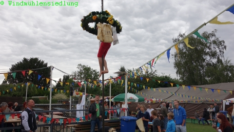 So eine Kletterstange ist was Anstrengendes! Sollte wieder mehr im Sportunterricht geübt werden und nicht nur bei uns zum Kinderfest. Aber hier ist die Motivation (in Form der oben hängenden Beutel) höher, stimmt's? Foto: © Detlef Garte // Windmühlensiedlung