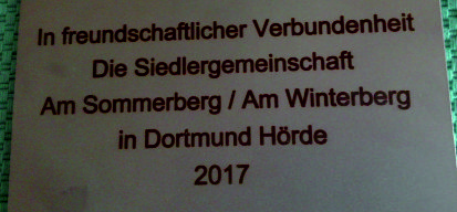 Seit Anfang der 1990er Jahre sind wir als Siedlergemeinschaft mit der Freiwilligen Feuerwehr in Kruspis partnerschaftlich u. freundschaftlich verbunden. Unser Geschenk zu diesem denkwürdigen Jubiläum wurde von einer Abordnung während des Festkommers überreicht: Eine Tafel aus Stahl, die an die Schwerindustrie in Hörde erinnern soll mit einer Stiftungsplatte unserer Siedlergemeinschaft.