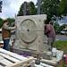 Das Fundament ist fertig, die Teile des Giebels sind in die Werkstatt des Bildhauers zur Restaurierung und Aufarbeitung transportiert worden.